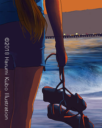 I voiced "Wow!" when I saw Yoshitaka Kobayashi's photography on Facebook. A young woman was looking up the first star at Shichirigahama beach against the gorgeous evening sky that was gradually changing colors from vivid orange to clear blue to indigo. He captured the story, temperature, wind, sound of waves and cars, the pulse of the lighthouse--watching his photo made me feel as if I was there. He was very kind to let me "rebuild the story" as an illustration. I appreciate Yoshitaka--undoubtedly his photography is the big inspiration of this illustration.